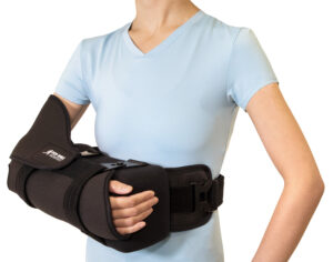 The sling is constructed using a breathable Kewl Mesh fabric and can be contoured for a stable comfortable fit without the need for a neck strap. The contoured pillow provides optimal post-operative positioning and a posterior elbow strap stabilizes the humerus preventing the arm from backing out of the brace. Optional shoulder strap included.